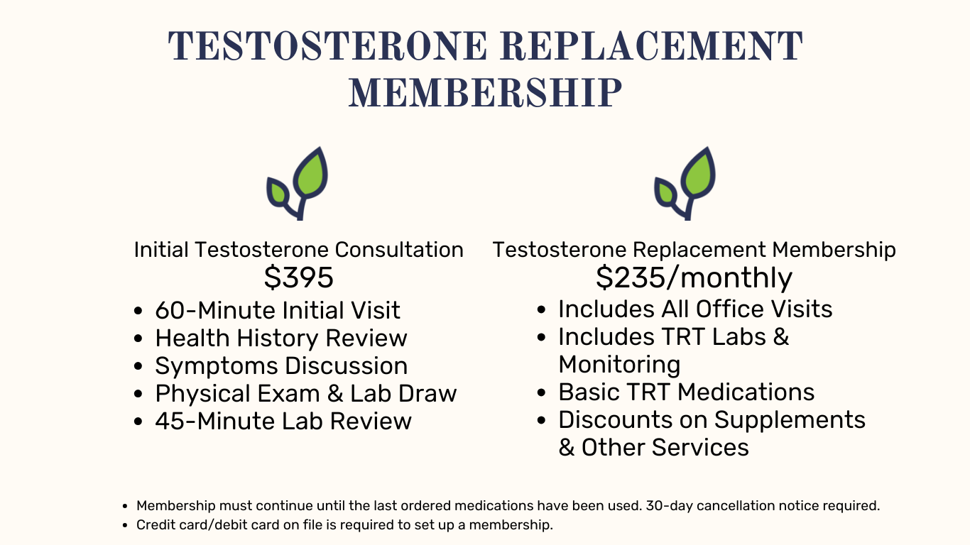 At your first visit, you’ll meet with the physician who will manage your care. We’ll review your health history, current symptoms, review any concerns, and complete a lab draw for a comprehensive lab test. You’ll then return for a follow-up visit to review your results, confirm whether you’re a candidate for treatment, and decide if you’d like to enroll in our membership program.